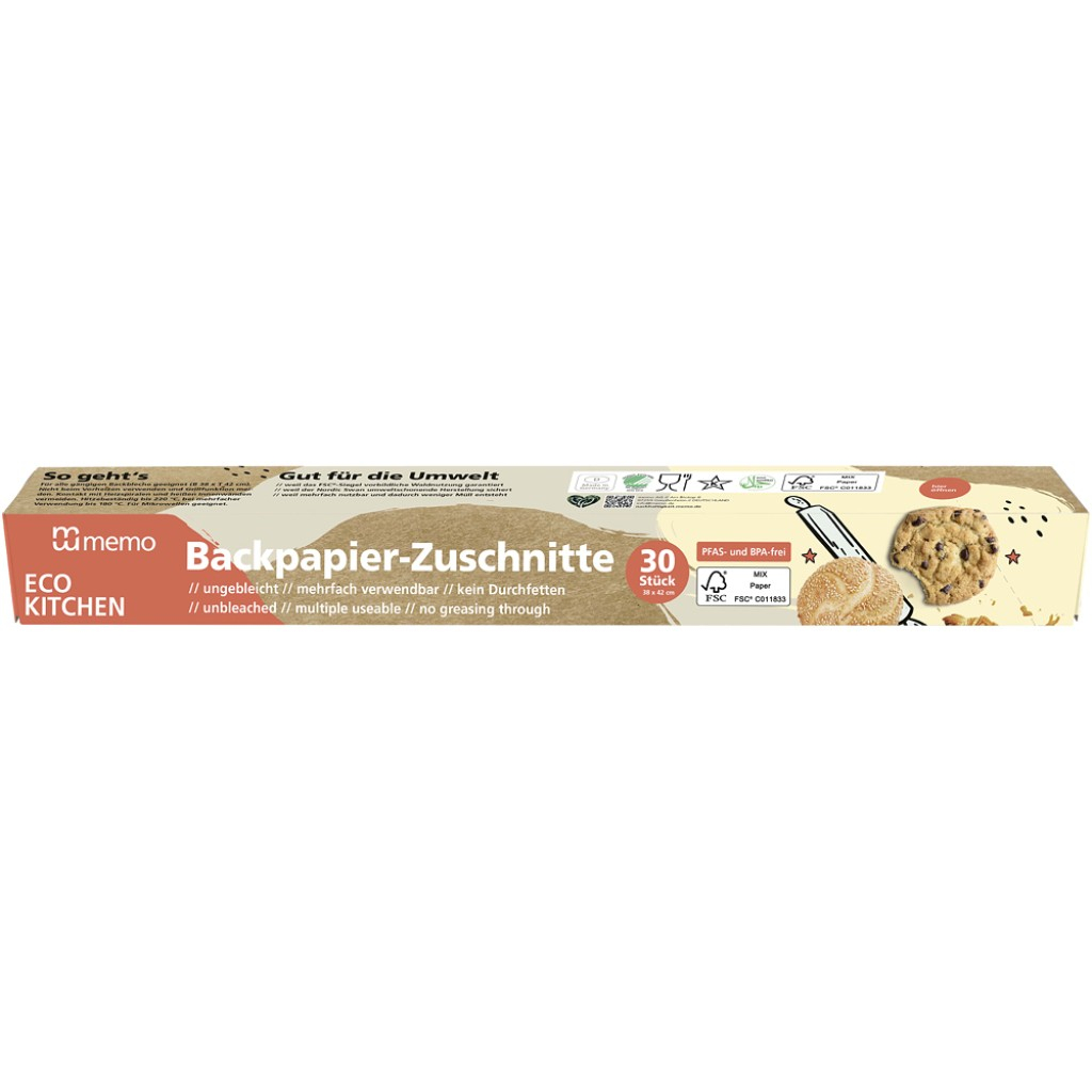 Foile de hartie pentru copt de la Memo reunesc raspunderea unei viziuni responsabile fata de mediul inconjurator cu utilitatea zilnica din bucatarie. Hartia nealbita este compusa doar din materie prima cu origine certificata si controlata. Produs certificat „Nordic Swan”, aceasta hartie este produsa in urma unor procese atente, conform unor reglementari stricte si nu contine bisfenol A, substante per-si polifluoroalchilice, dar si alte substante nocive. Atentie! A se evita contactul cu zonele fierbinti ale cuptorului (ce se incalzesc prin inductie sau ventilatie). Rezistenta pana la o temperatura de 220 de grade Celsius si de mai multe ori la o temperatura maxime de 180 de grade. Se poate folosi si pentru cuptorul cu microunde. Potrivite pentru toate tavile de copt standard. A nu se utiliza in timpul preincalzirii cuptorului si a se evita utilizarea acesteia cand cuptorul este setat pe functia grill. Foile de copt sunt acoperite cu silicon pe ambele parti, astfel se impiedica scurgerea de grasimi. Nu se lipesc si nu este nevoie de ungerea acestora.