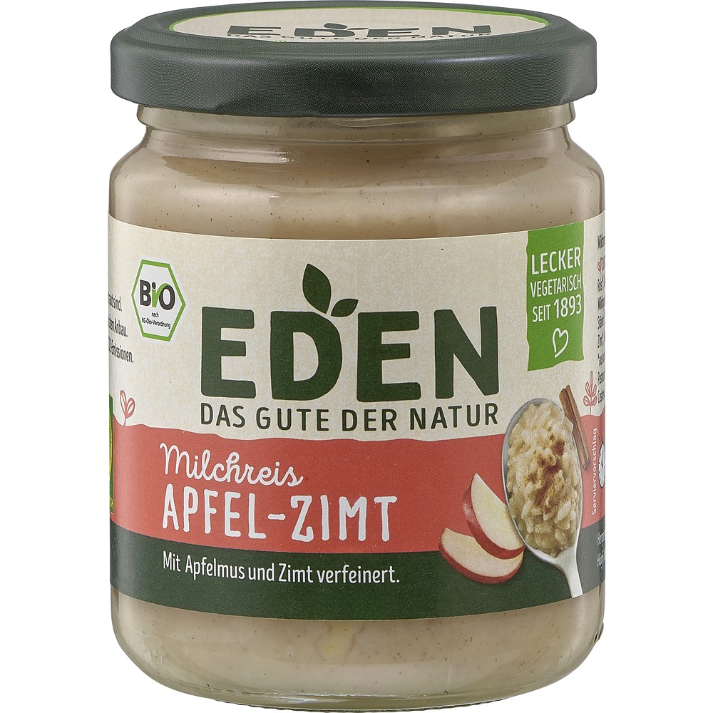 31% orez prefier*, apa, 10% piure de mere*, 9,3% lapte din lapte praf, 8,3% frisca*, zahar brut din trestie de zahar*,amidon*, concentrat din suc de lamaie*, sare de mare, scortisoara*, agent de ingrosare(guma de guar)*. *provin din agricultura ecologica.
